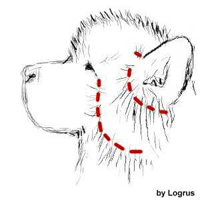 Bakom öronen växer ofta mjukt och alldeles för långt hår som stör huvudformen. Klipp från öronfästet och neråt. (Se bild nedan)